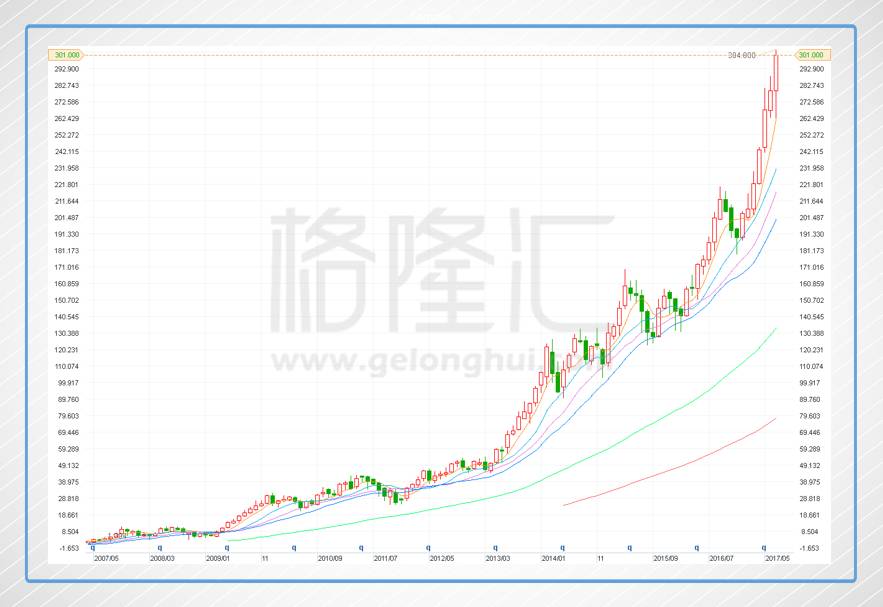 在过去10年里,你几乎任何时候打开这个图,腾讯的股价都是这种三十度向上的趋势。