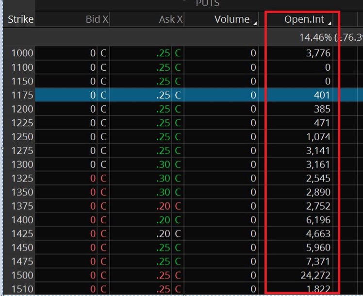 根据VIX的计算模型,这些深度价外的PUT都会被代入计算。因此VIX在这种情况下会显著升高。另外一种情况在市场利好不断持续上扬时,CALL端的肥尾效应并不明显,贪婪比恐惧显得更有节制,这也是为什么VIX在下跌比上扬时更敏感的原因。根据以上原理,VIX有时候会被一些大型的机构操纵,特别是VIX期货交割日,机构会大肆买入非常廉价的价外的PUT,大部分在0.05-0.20之间,推高VIX(如图所示,大盘1500以下的价位的PUT存在5万多手)。 所以喜欢交易VXX、UVXY等衍生品的朋友应避免在VIX期货交割日附近做交易。