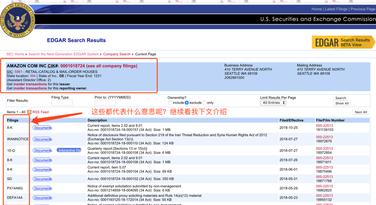 然后来到亚马逊的SEC主页,但是下图圈圈的东西都代表什么意思呢?且看下面继续聊哈: