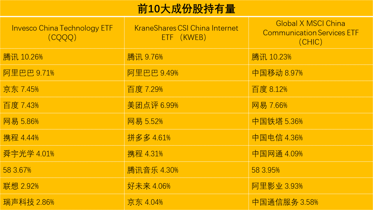 Invesco China Technology ETF(CQQQ)、KraneShares CSI China Internet ETF和Global X MSCI China Communication Services ETF(CHIC)是三只专门追踪中国互联网业的ETF,它们主要持有中国在海外上市的互联网公司股票,产业和成份股的构成也相当类似。