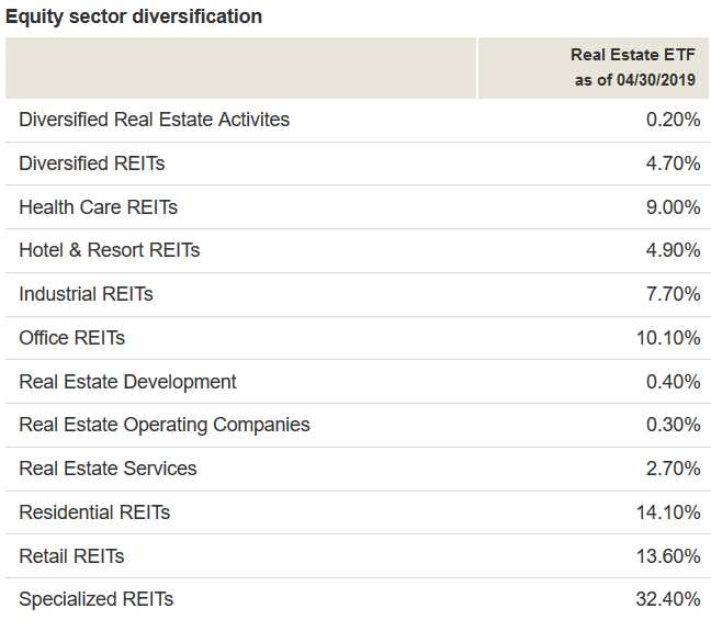 VNQ追踪MSCI美国房地产投资信托基金指数,该指数包括一百八十多只权益型REITs,投资范围包括医疗、工业、办公楼、酒店及住宅等房地产,覆盖了美国房地产投资信托市场约三分之二的价值。