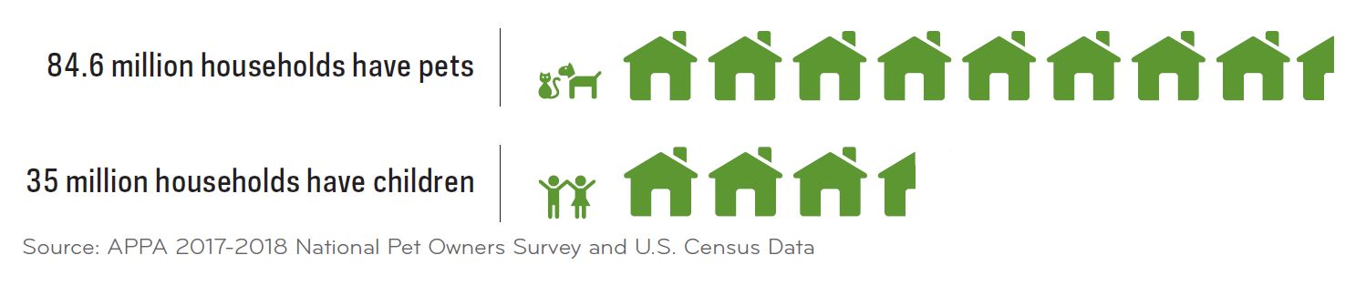据美国宠物商品协会(APPA)报告,2018年美国有8460万个家庭养有宠物(猫狗),这比3500万个养有小孩的家庭还多出近5000万。同时报告显 示美国的婴儿潮一代和千禧一代是推动养宠的两大动力,并且推动他们养宠的因素会不断地增强。在美国,年过70的人有40%养宠,随着婴儿潮一代逐年增加, 这个比例将会不断上升。最新的Harris调查显示,很多千禧一代在生小孩前都有养宠,目前还没有养宠的有43%表示他们将来会养宠物,不少人甚至表示在 买房时也会将宠物的需求考虑进去。