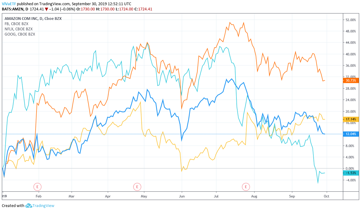 从公司股票的角度看,FANG概念股前几年表现卓越,回报率在美股中遥遥 领先,因此在很长一段时间里为美国最受喜爱的投资组合。近期,FANG的股票被投资者不断的质疑,因为它们接二连三的出现问题,激起了民众对它们的不满, 而且这些问题已经上升到了政治层面。越来越多的民众和政客提出要对包括FANG公司在内的科技寡头提高监管,有些政客甚至提出要拆分这些科技寡头以降低它 们对国家和社会的影响力。尽管如此,除了奈飞的表现不尽人意,亚马逊、脸书和谷歌的表现相当不错,带动持有它们的ETF连连上涨。