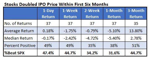 同样,从理论上讲,这些是从根本上向公允价值增长的强势股票,当它们以两倍的IPO价格被不公正地抛售时。获利后,股票跑赢大市以追回公允价值。也许有一种方法可以获利两次:达到两倍时卖出,两周后购买。
