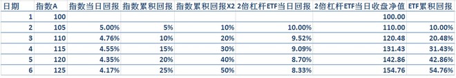假设指数单边上涨,我们可以看到在第六天收盘时ETF的累积回报(54.76%)超过了指数本身的累积回报的两倍(50%)。