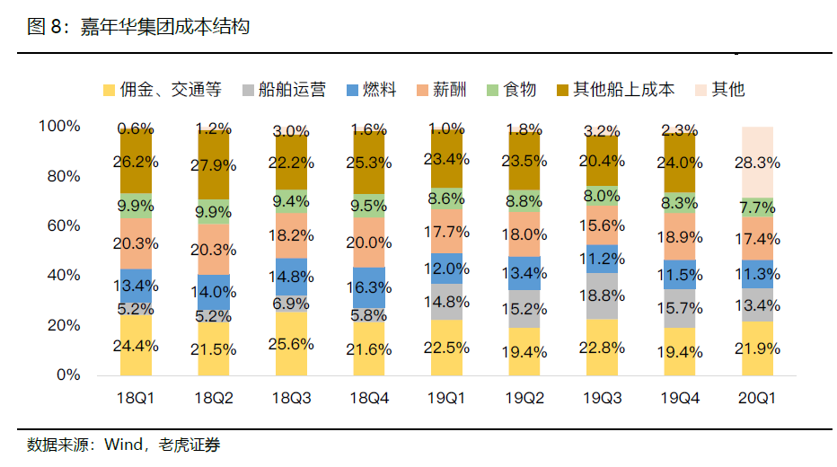 嘉年华邮轮的船票收入大致可以覆盖其营业成本,乘客在船上的其他消费就基本可以理解为公司的营业利润。疫情导致嘉年华盈利恶化,公司预告2020年将转亏,为了避免债务违约,年内只能依赖融资性现金流来借新还旧。