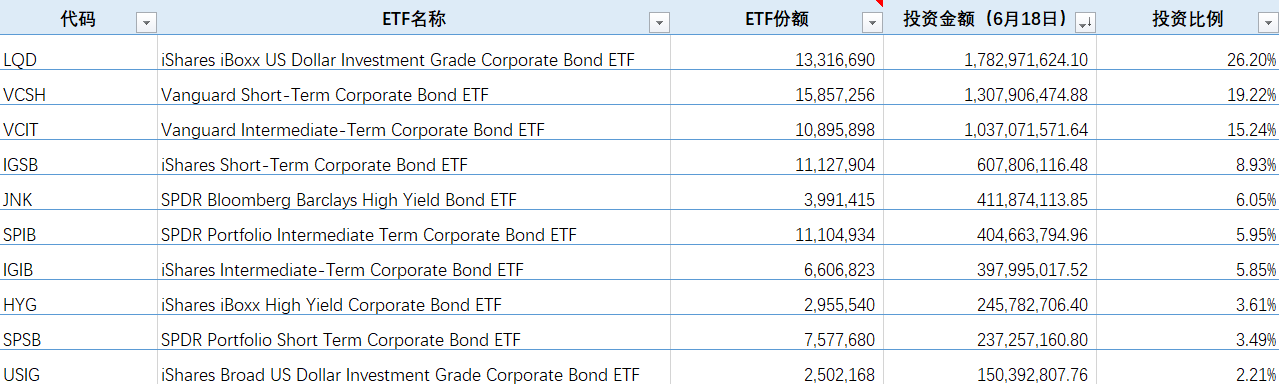 近日,美联储公布了其持有的债券ETF,我们看到,从5月12日到6月16日,美联储共购买了16只ETF总计68亿美元,主要为中短期的投资级别企业债 券,持有量最大的三只ETF为:iShares iBoxx$ Investment Grade Corporate Bond ETF(LQD)、Vanguard Short-Term Corporate Bond ETF(VCSH)和Vanguard Intermediate-Term Corporate Bond ETF(VCIT)。这一举动让美联储一举成为了这些ETF的主要或大型投资者,例如LQD,美联储对其投资的18亿美元目前占总基金的0.03%,属第 三大持有者。