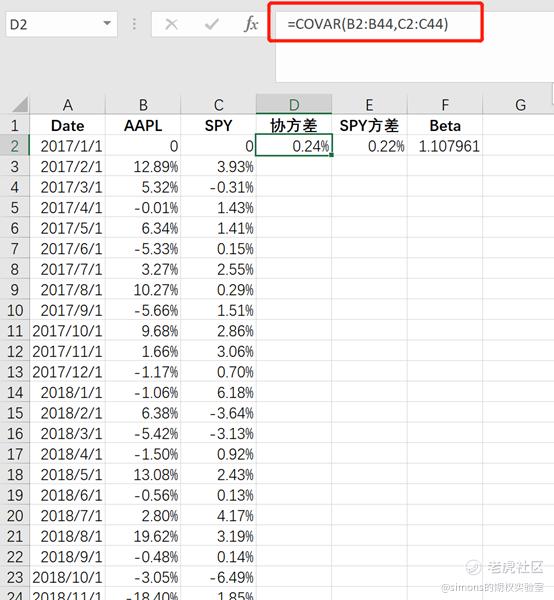 我们来继续操作excel,从yahoo财经上下载spy的股价数据,与之前AAPL起止时期相同,从2017年1月1日开始至2020年7月31日。讲AAPL和SPY收益率粘贴于A列及B列,用excel函数covar()可以计算2者协方差,用var()函数计算spy方差,协方差和方差相除即为beta。