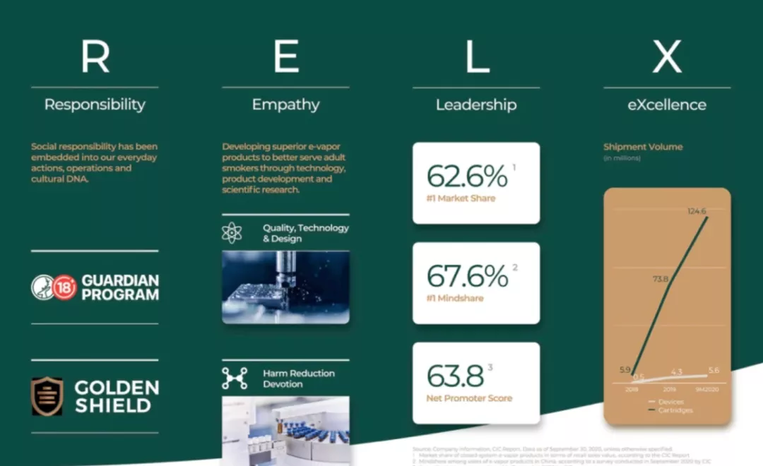 雾芯科技公司以RELX品牌运营,在零售方面,其在中国的闭式电子蒸发产品市场占有62.6%的份额。该公司已与110个授权分销商合作,向5,000多个RELX品牌合作伙伴商店以及遍布全国250多个城市的全国100,000多个其他零售商店提供产品。截至2020年9 月30日的9个月,收入几乎翻了一番,达到3.24亿美元,净收入为1600万美元。在截至2020年9月30日的12个月内的销售额为4亿美元。香