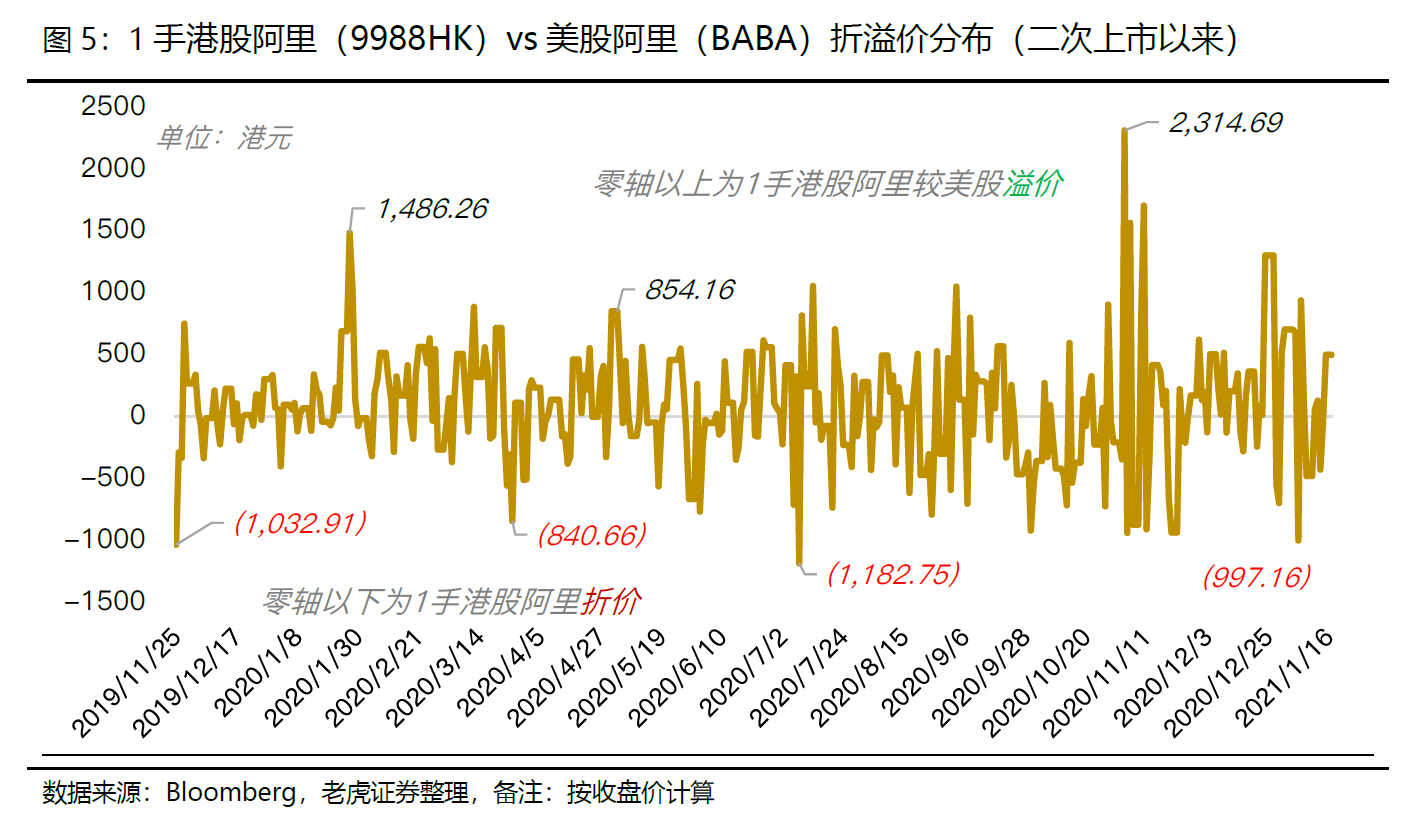由于ADS和港股普通股可以互换,因此AH的折溢价也成为市场参与套利的一种方式。我们以阿里为例,上市以来,港股阿里有58%的时间处在溢价区域,每手最高溢价达2314港元;42%的时间处在折价区间,每手最高折价达1180港元。