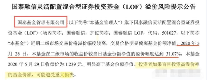 在场内买LOF基金要特别注意一点,那就是「溢价率」。上个月有一只神奇的LOF基金,国泰融信(501027)在5月28日溢价率高达31%。基金净值只有1.05,但在场内被炒到了1.377,真的是人傻钱多啊!