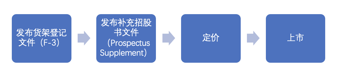 通常来讲,若发行人已保持上市公司的身份至少达到12个月,且及时报备其定期报告,则其有资格使用S-3表格(外国发行人为F-3表格)来进行货架登记。货架登记为公司增发的一种受欢迎的登记形式。 顾名思义,货架登记为先把股票放在货架上登记,等到合适的时机来进行定价销售。具体操作流程为公司确定好承销商之后,发布F-3或者S-3文件,就是增发的基本招股书(prospectus)。基本招股书中包含有关于未来可能发行之股票的概要描述以及其它的概要信息。而实际发行时,需编制补充招股书(prospectus supplement),对基本招股书中的信息进行补充,补充招股书中包含关于股票的特定信息以及发行的条款。在F-3文件的有效期限内,公司每次只需要编制和发布补充招股书(prospectus supplement)并每次进行一些更新,便可以增发。