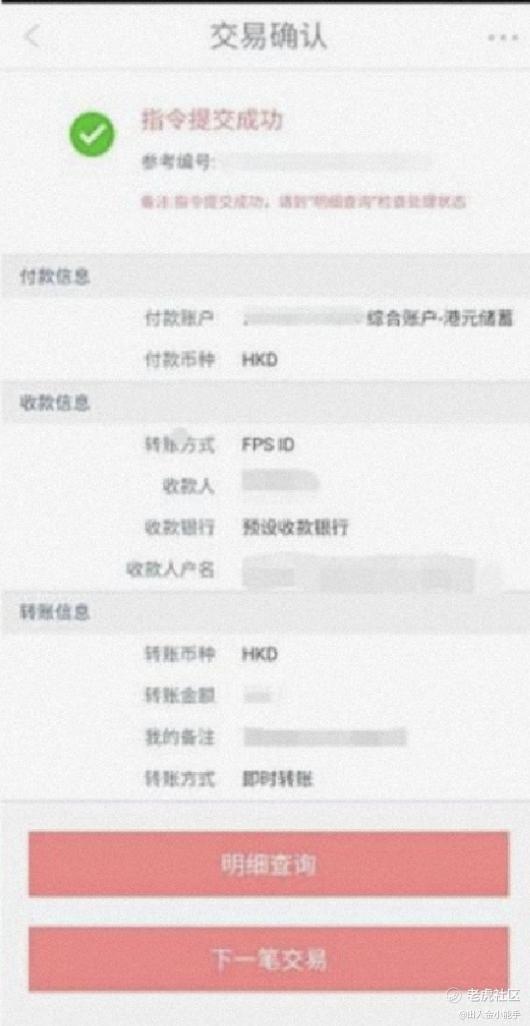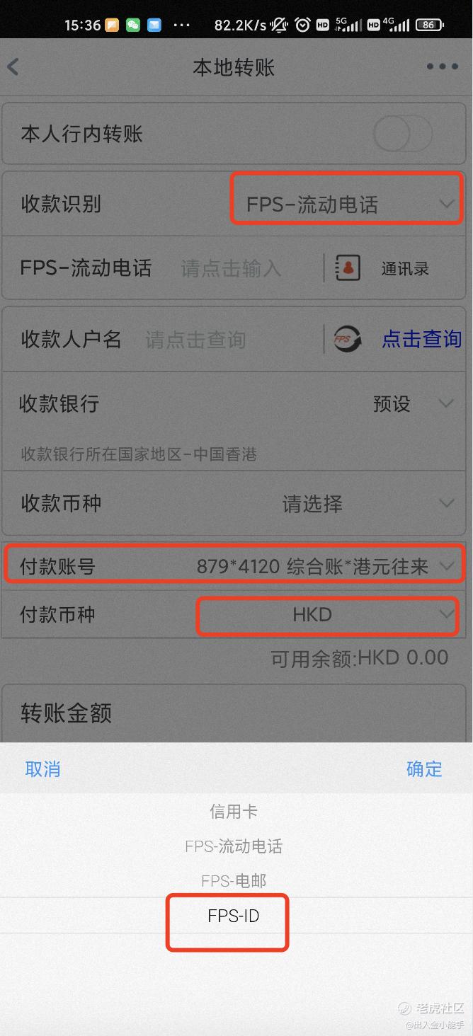 9.收款识别,需选择FPS-ID;注意付款账号及付款币种,如果是港币入金,付款账号选择港元往来账号,付款币种选择HKD。将在老虎证券APP复制的FPS-ID粘贴到对应位置,点击“点击查询”按钮,确认老虎收款账户。