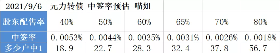 假设股东配售率达80%,那么差不多56户中1。其他的配售率和中签率对应关系可以参考下表~~祝各位中签,大赚!