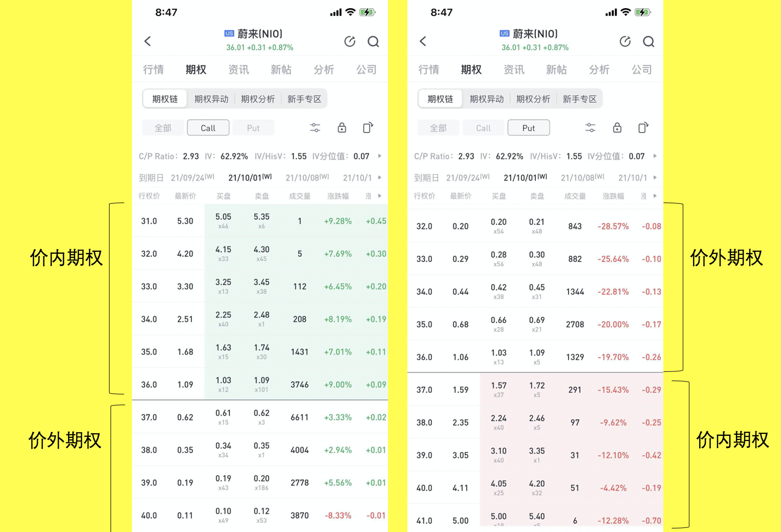 举个例子,下图为蔚来10月1日到期的期权,蔚来目前的股价为36.01,左侧为蔚来call的期权链,绿色部分为价内期权,右侧为put的期权链,红色部分为价内期权