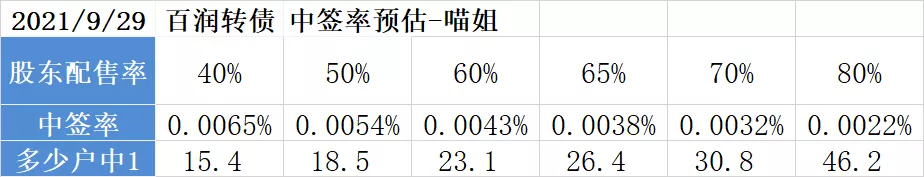 6、9.28收盘转股价值105.70,预估上市价在124元上下。具体情况咱们上市前再来评估。假设股东配售率达80%,那么差不多46户中1。其他的配售率和中签率对应关系可以参考下表~~祝各位中签,大赚!