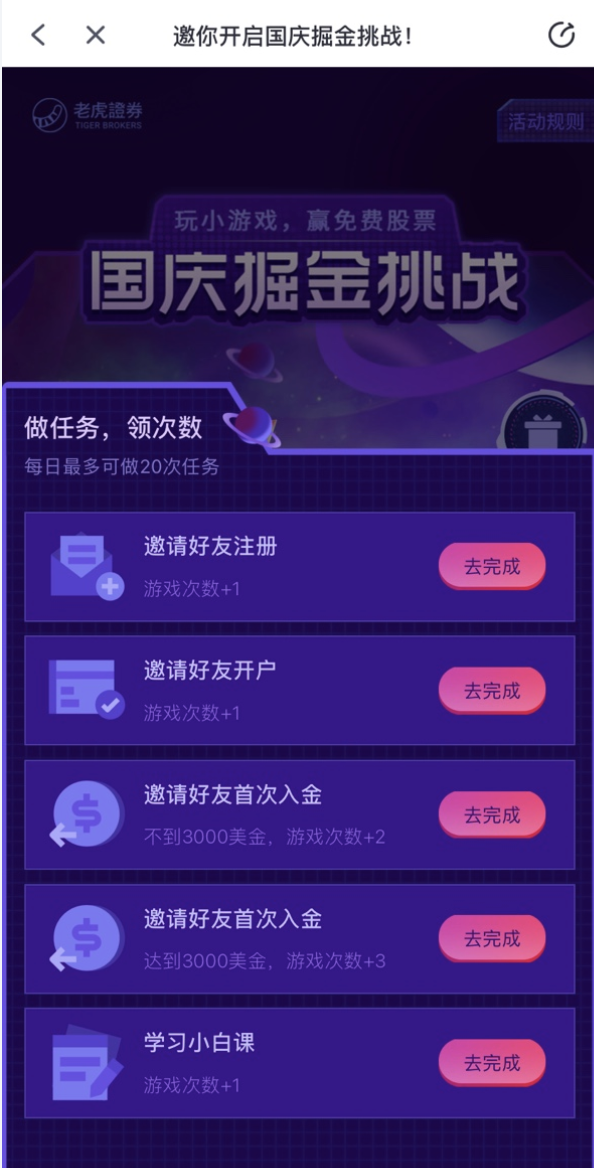 未经允许不得转载:美股开户 » 玩小游戏,赢免费股票 ,老虎国庆掘金挑战正式上线!