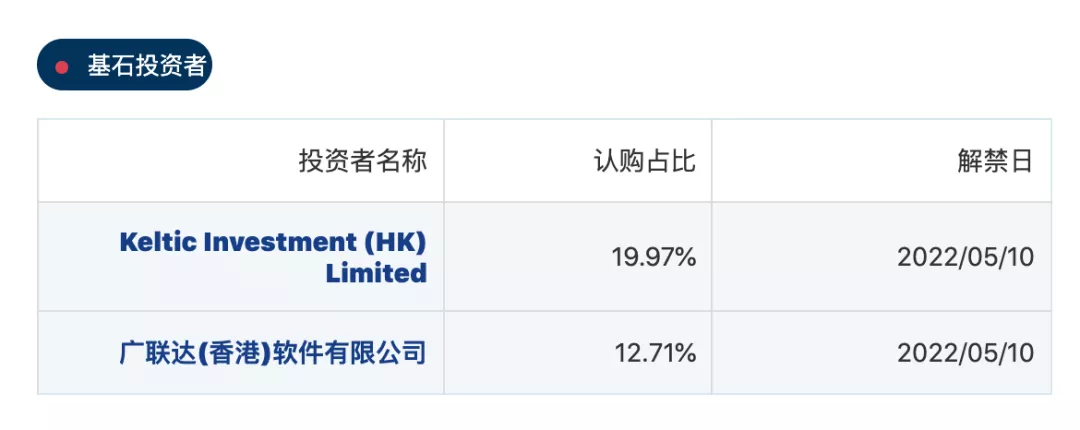 3.- 引入2名基石投资者,合共认购9,000万港元),其中包括投资管理公司Keltic及深圳上市公司广联达科技,分别认购5,500万元及3,500万元,按中间价计算,约佔发售股份32.68%,设6个月禁售期