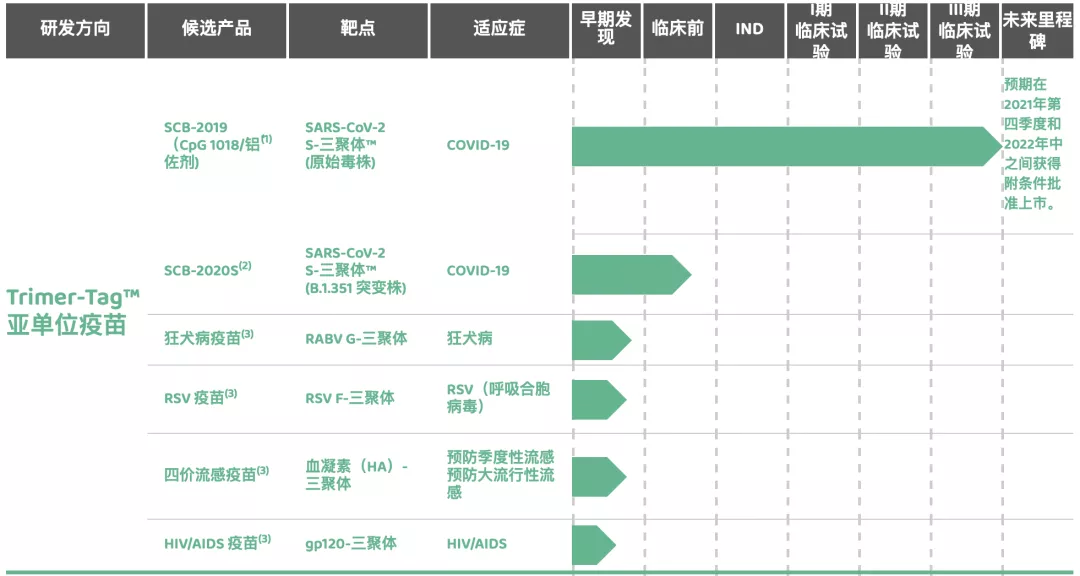 产品管线包括(i)六种Trimer- TagTM亚单位候选疫苗,包括SCB-2019(CpG 1018加铝佐剂)(我们于2021年9月取得其SPECTRA结果),(ii)两种Trimer-TagTM肿瘤治疗候选产品,包括SCB-313(我们正在中国及澳大利亚对其进行五项I期临床试验),及(iii)三种Fc融合蛋白候选产品,包括SCB-808(我们正在中国对其进行一项关键性III期临床试验)。