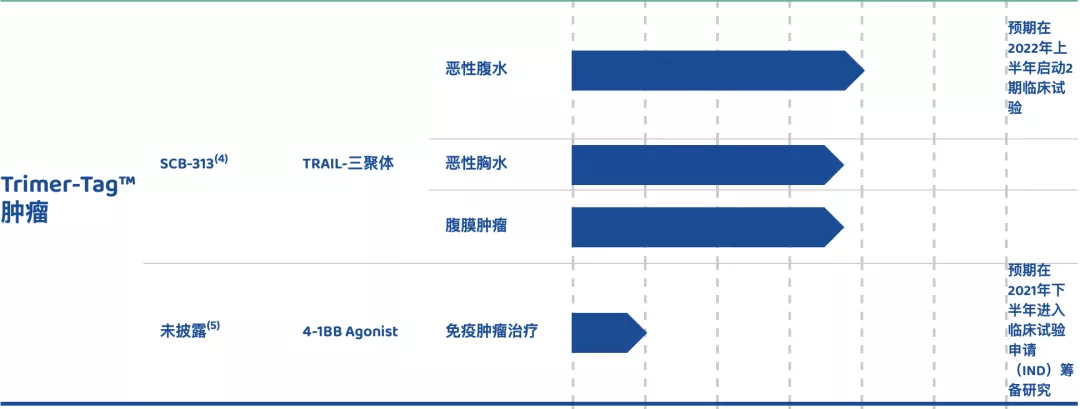 已成功利用Trimer-TagTM技术平台设计并开发SCB-313,其为共价连接的类天然三聚体融合蛋白,在结构和功能上都与靶向该渠道的二聚体抗体构架及其他原生配体候选产品不同。SCB-313有潜质可满足全球对腔内恶性肿瘤(包括MA、MPE及PC以及其他癌症适应症)治疗需求的缺口。正在研究免疫肿瘤及免疫适应症的TNFSF其他靶点。目前正在开展发现项目,评价靶向4-1BB渠道(TNFSF成员)的三聚体融合蛋白候选产品。