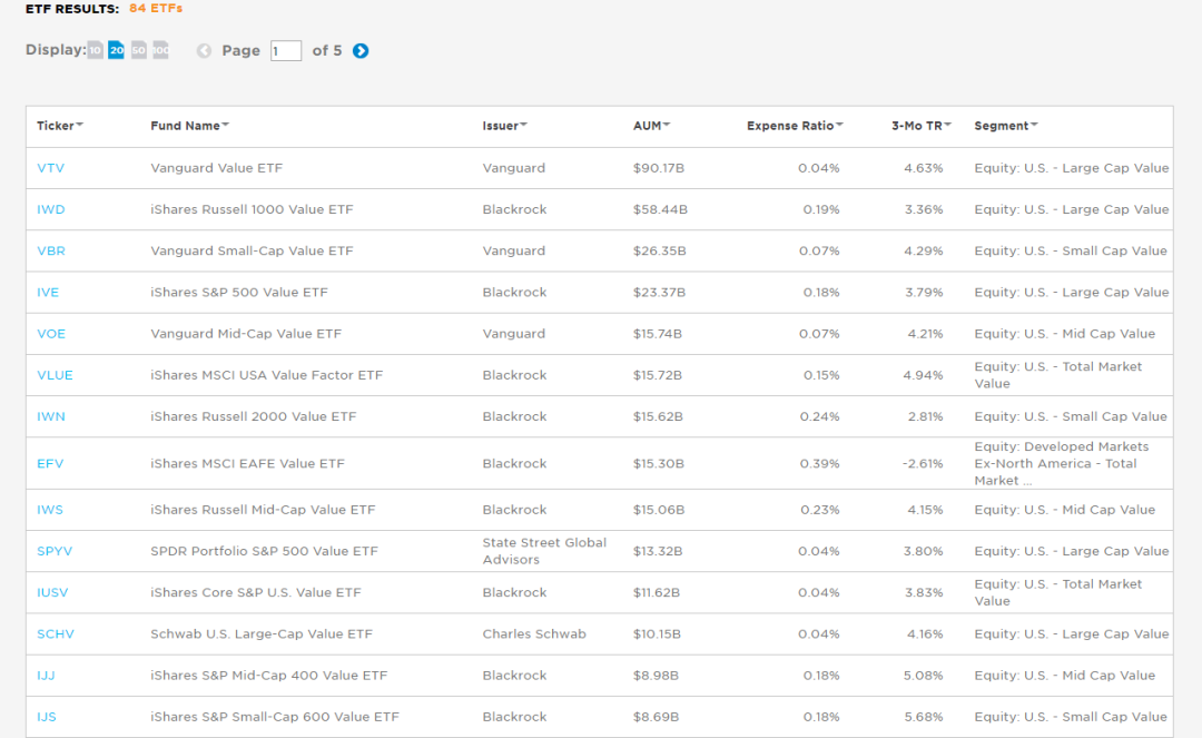 - 第一步:打开这个免费的神奇小网站:ETF.COM,在里面搜索“value”,就可以轻松查找到美股市场中,几乎所有与价值相关的ETF。他们所使用的的模型肯定有所不同,但是大方向都是一致的。