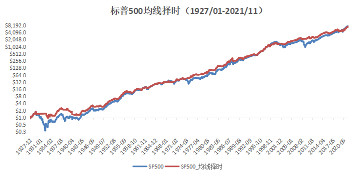 从这个净值曲线中不难看出,虽然两者最后的收益率不相上下,但是均线择时策略(红色线)的波动和回撤明显的要好得多!无论是上世纪20年代的经济大萧条、70年代的海湾石油危机,还是00年的互联网泡沫、08年的次贷危机...只需要自己动手,做一个简单的均线模型,就能安稳的抱着股票睡大觉了。