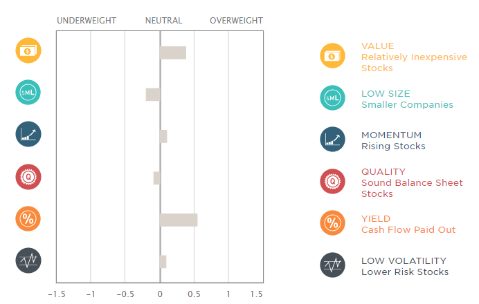 - 第三步:在ETF的详情页面中,查看value的偏好程度(参考下图中黄色部分),OVERWEIGHT越多,就说明该ETF目前的value属性越强,也就更符合价值投资者的需要。比如下图是VTV的风格暴露,它的yield暴露很大,甚至都超过了value,所以在一定程度上就不是价值投资者最佳的选择了。