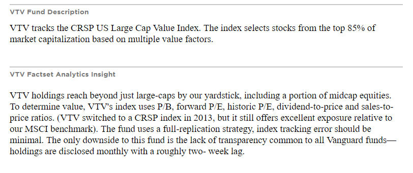 - 第二步:根据名字和描述,选择一个适合自己的ETF。需要注意的是,并不是名字中带有“value”的,就一定是量化投资策略。具体需要在详细介绍页,仔细查看。下图以VTV为例,看它的构成方式和投资逻辑。