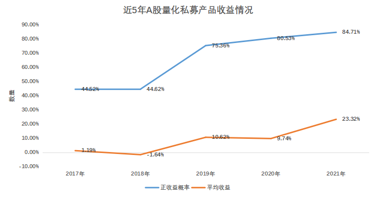 量化本质上,就是一种投资的工具,并不能保证任何收益;相反的,如果模型失效或者逻辑发生错误,甚至会造成不小的亏损。据统计,近五年A股市场中的量化私募产品,获得正收益的概率(蓝色线)从40%-80%不等,与当年的股市大行情密切相关。同时,量化产品的平均收益(橙色线)也起伏很大,2018年熊市时候甚至是为负;换句话说,2018年,市场上超一半的量化产品亏钱了,算上另一半赚钱的一起来平均,还是亏的。