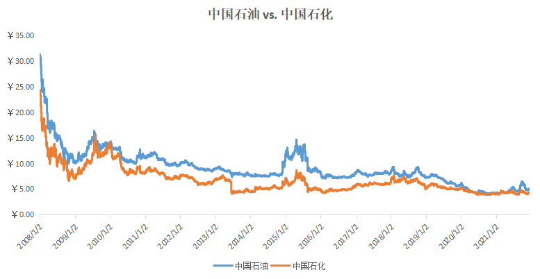 我们以中国石油和中国石化为例,抛开个别的特殊问题,大致可以认为这两者的经营模式、市场规模、未来前景都极度相似。在大部分时间内,两者的涨跌幅都十分相似。从数据上来看,两者收益的相关性高达0.95,可以套用配对交易模型。