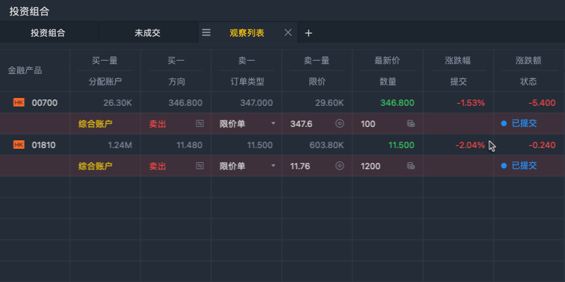 投资组合功能是管理当前投资模型或持仓的有效工具。投资组合功能集仓位管理、订单操作、行情监控于一体,可以监控当前账户所有头寸变化,快速操作头寸。