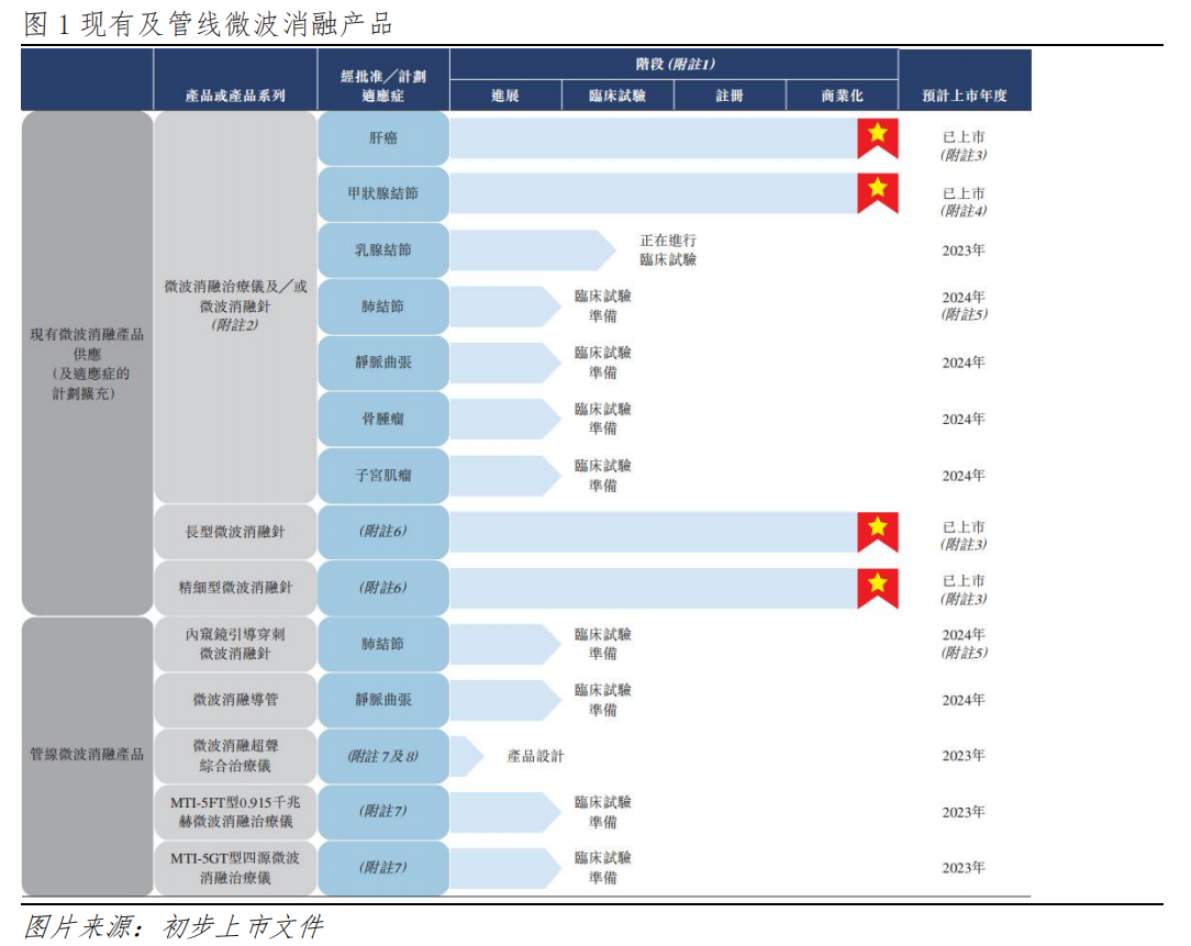 公司的业务主要针对与微波消融技术具有显著协同效应及巨大市场增长潜力的专业领域,包括:1)良性肿瘤,特别是甲状腺结节及乳腺结节;2)恶性肿瘤,特别是肝癌及肺癌。产品供应及管线产品主要包括:微波消融治疗仪以及与治疗仪配合使用的微波消融针。