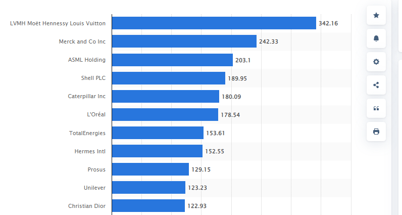 在市值最高的欧洲上市公司中,三家奢侈品公司占据一席之地,如下图所示。 截至 2022 年 12 月泛欧证券交易所最具价值的上市公司(十亿欧元):