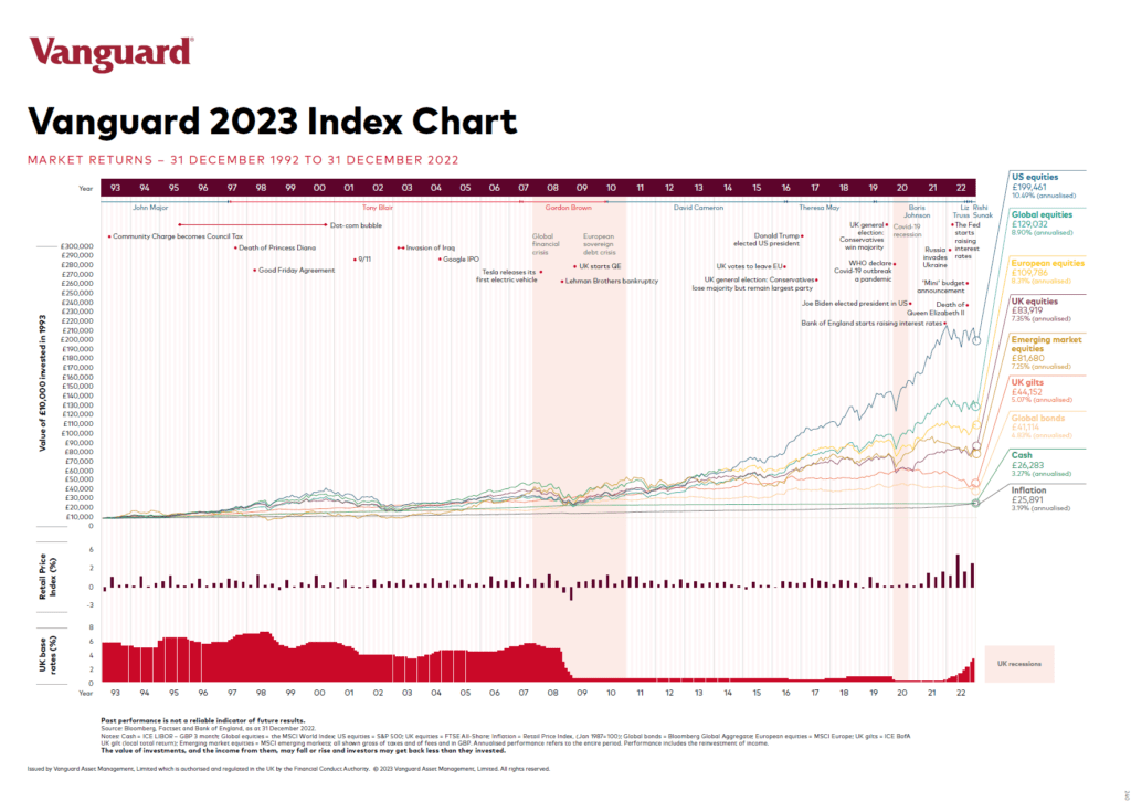 自英国脱欧开始以来,英国股市近年来表现不佳。与美国同行相比,英国股市在 1993 年至 2023 年的回报率很低,如下面的 Vanguard 2023 指数图表所示。自 1993 年以来,美国股票的年回报率为 10.49%,而英国股票的年回报率为 7.39%。甚至欧洲的回报率也高于英国。