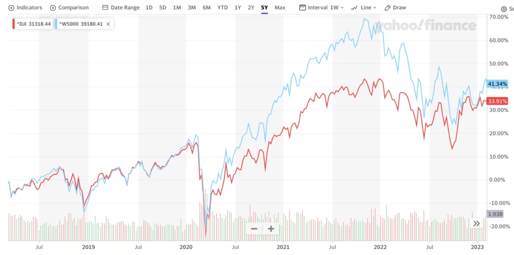如果把道琼指数和威尔夏5000 指数做比较,会发现两者的走势相当相似: