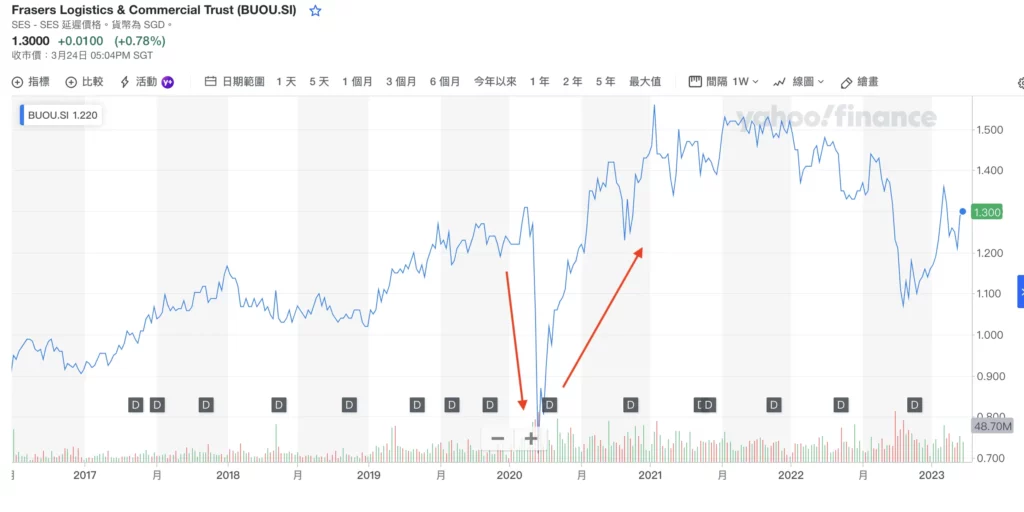 举个例子,Frasers Logistics & Commercial Trust(BUOU.SI)在2020/03/02 至2020/03/23 期间受到疫情恐慌,价格从SGD 1.27 下跌至SGD 0.66,跌幅近50%,整个过程不到一个月,但在这之后股价开始回升,直到2021/06/24 收于SGD 1.4。