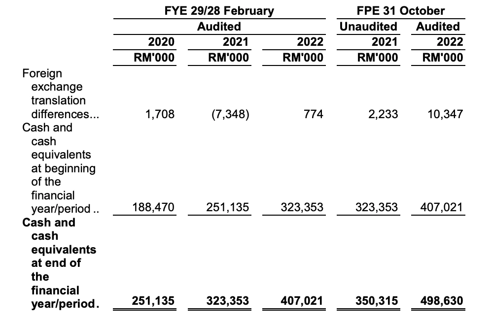 目前公司的现金流是健康的。截至2022年10月31日,经营活动的净现金为1.996亿令吉且支付了约为1.141亿令吉的所得税。截至2022 年10月底,该集团的借款总额为2.3362亿令吉,而其现金和现金等价物为4.702亿令吉。