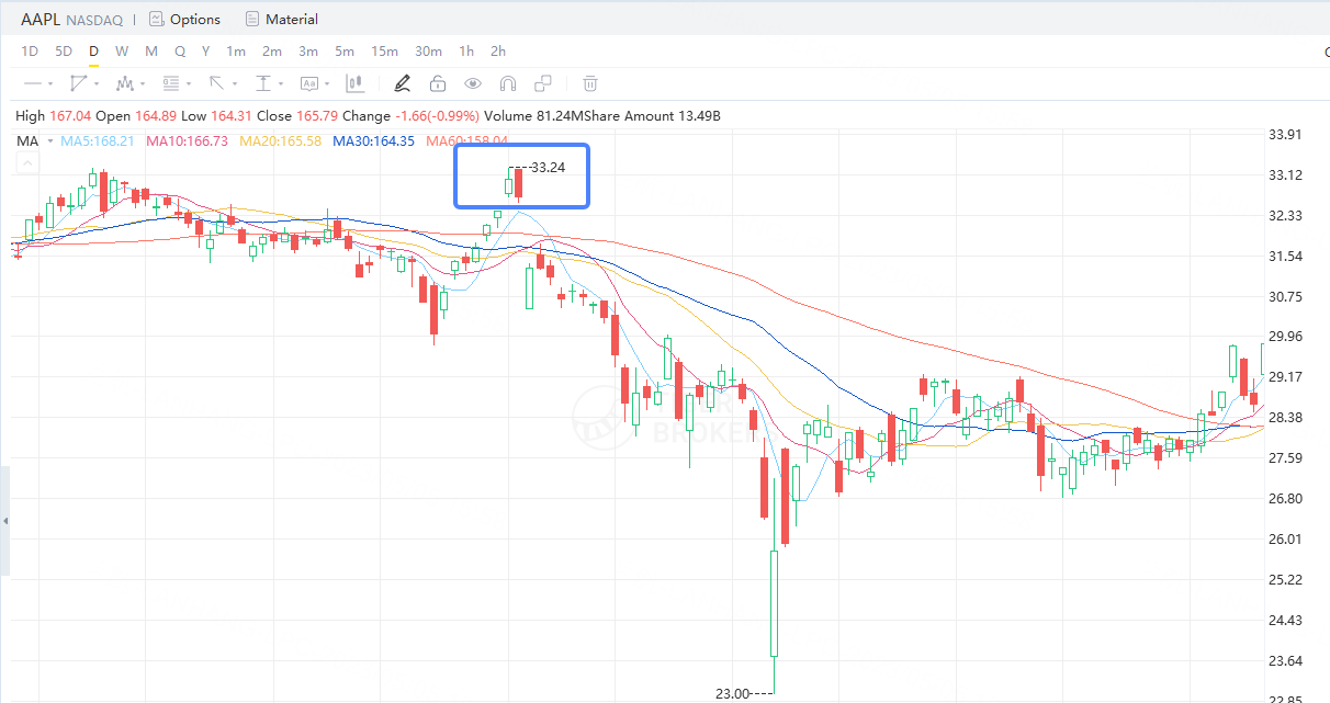 在 2015 年 7 月 20 日到 21 日,苹果公司的股价在连续上涨之后出现了乌云盖顶形态(区间顶部),这个形态表明了价格可能会下跌,随后苹果公司的股价出现了一段时间的下跌。