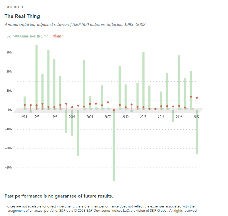 在图表所示的时期内,扣除通货膨胀因素后,股票的平均年化回报率为 7.0%。在高通胀时期这是一个非常好的回报率。