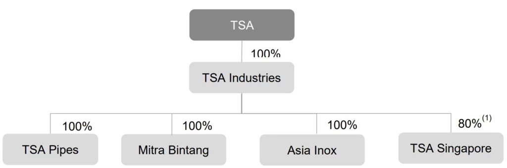 TSA Group Sdn Bhd 于2022年3月18日成立,起初以私人有限公司的形式注册。随着业务的发展和扩张,公司于2022年11月1日转变为公共有限公司,并采用了现在的名称。在2023年10月31日,TSA Group Berhad 成功地完成了对TSA Industries 的收购,使TSA Industries、TSA Pipes、Mitra Bintang、TSA Singapore 和Asia Inox 成为TSA Group Berhad 的子公司。