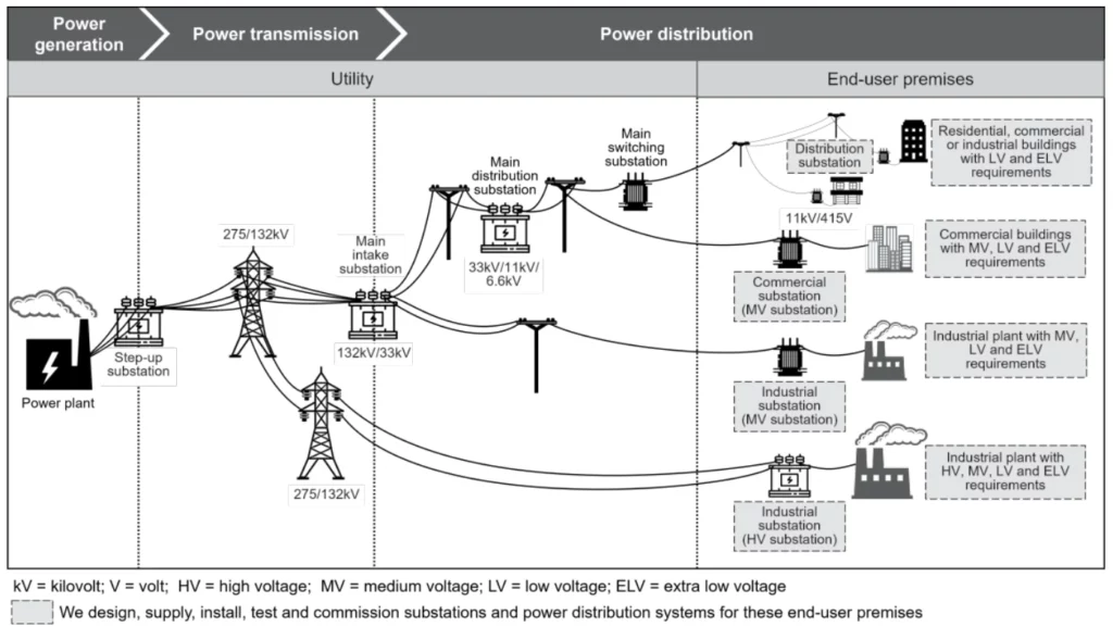 在整个电力传输过程中,HE Group Berhad 展现了在高压(HV)、中压(MV)、低压(LV)和极低压(ELV)配电系统设计和实施的全面能力。
