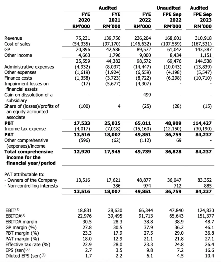 从2021 财年至2022 财年,该公司的的总PBT 录得RM 65.0 million,PBT 利润率为27.5%。 2022财年的总PBT 高于2021财年的RM 25.0 million,且PBT 利润率较2021财年更高。 2022财政年度的PBT 利润率较高是由于较高的毛利率和其他收入,但部分被较高的其他支出和财务资产减值损失所抵消。由于某些其他收入不计税,该财年的有效税率低于法定税率,如RM 7.3 million 的Keyfield CRNCPS 公允价值调整(fair value adjustment)和前一财政年度递延税费(deferred tax)的超额拨备。因此,2022财年的税后利润为RM 49.9 million ,税后利润率为21.1%。