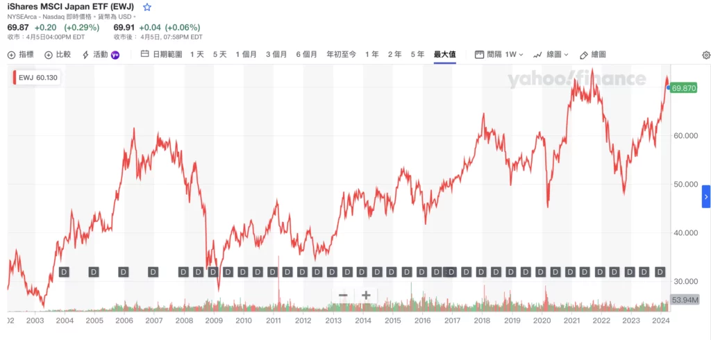 EWJ(iShares MSCI Japan ETF)主要追踪MSCI Japan Index,这个指数主要涵盖日本的大型公司,譬如Toyota、Sony 等企业,其早在1966 年就成立,是相对老牌的日本ETF,也是最具代表性的日本ETF 之一。