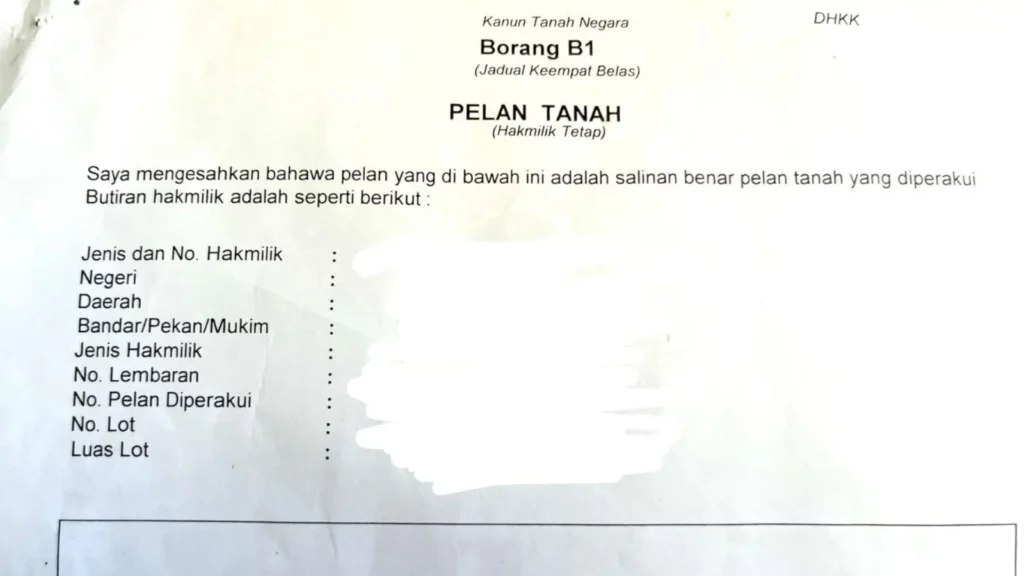 马来西亚地契通常由几张纸组成,马来语称为 Geran,英文是 Land Title,是由土地与矿物局(Pejabat Tanah dan Galian,PTG)颁发给土地或房产拥有者的官方文件,上面详细记载着土地或房产的信息,如合法拥有者的身份信息、房产的面积、土地的用途或产权年限等。
