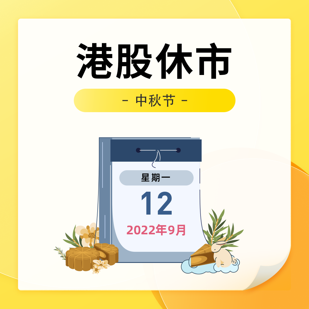 3尊敬的投资者: 中秋节即将到来,香港市场和A股市场的交易活动将受到影响。请留意股市休市时间,并提前安排好您的投资计划。 2022年中秋节假期即将来临!各主要市场休市安排如下: 港股: 9月12日(周一)休市。9月13日(周二)起照常开市。 A股: 9月12日(周一)休市。9月13日(周二)起照常开市。 美股、英股、澳股、新加坡股市照常交易。 沪股通和深股通:...