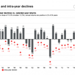 1与标准普尔 500 指数类似,英国股票市场的富时全股票指数在最近几年的大部分时间里也产生了正的年终回报,尽管年内跌幅为负。下图显示了从 1986 年到 2022 年迄今为止,富时全股指数的年内最高跌幅与年末日历回报: 注:富时全股指数由英国市场的富时 100、富时 250 和富时小型股指数组成 这个灰色条显示了 FTSE All-Share 的年终回报,但红...